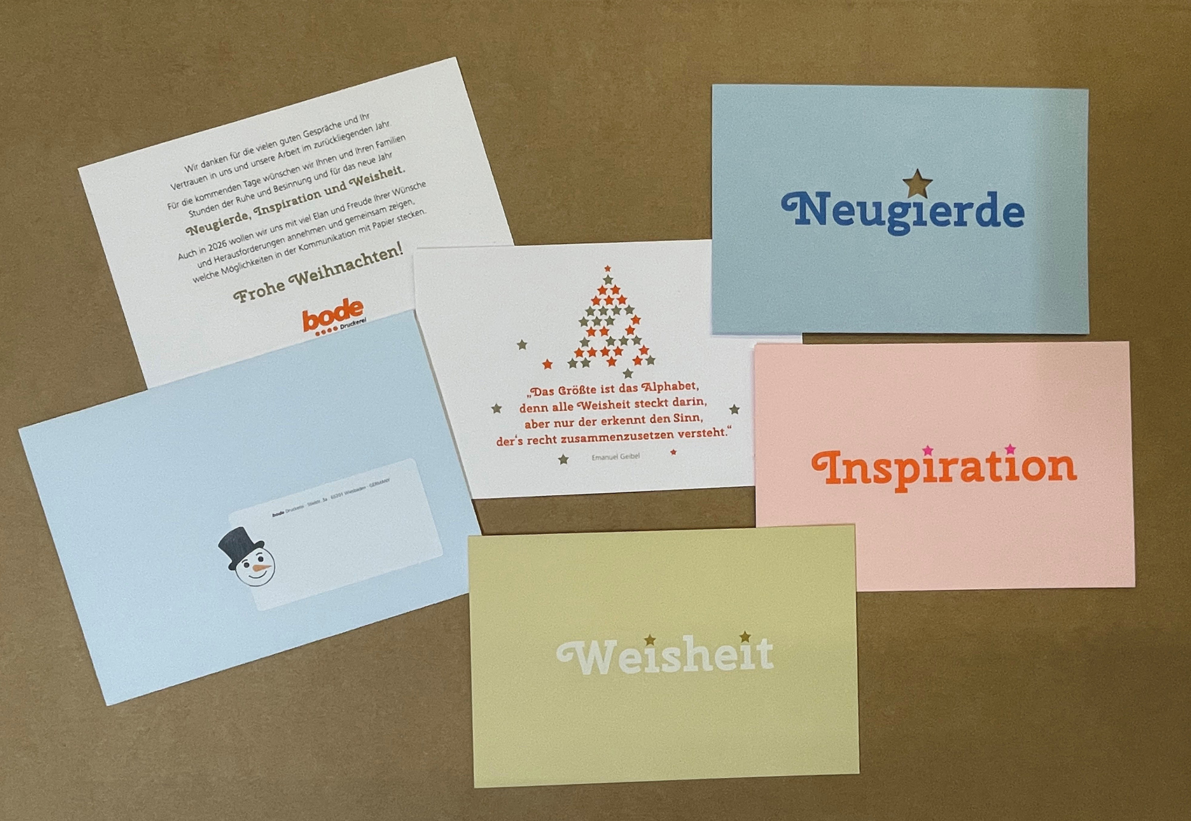 In diesem Jahr setzen wir unsere Tradition fort – so stammt der Karton der Weihnachtskarten und auch die Briefumschläge komplett von der Papierfabrik Gmund, deren Arbeit wir sehr schätzen. An dieser Stelle herzlichen Glückwunsch an den Tegernsee zum Gewinn des Deutschen Nachhaltigkeitspreis 2026 als Unternehmen in der Branche Papier, Karton, Pappe! Und danke, dass die Farbauswahl so groß ist und wir unsere Tradition – immer neue Kartonfarben zu nutzen wohl noch ein wenig durchhalten können.